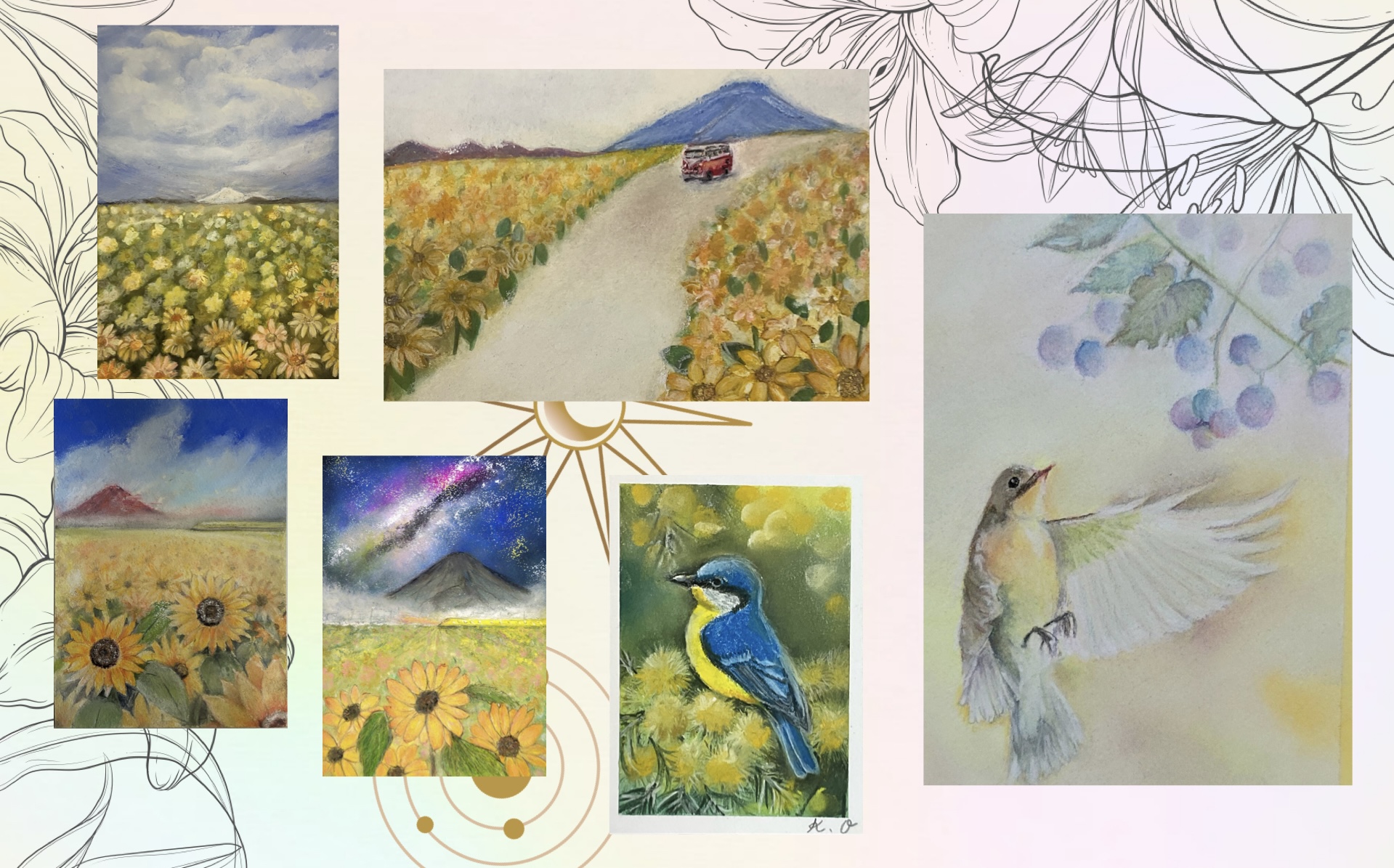 パステルを塗り込みすぎてくすんでしまわないように気をつけながら頑張って取り組まれています。空の雲も素敵です。赤いバスが走る向日葵の道もほっこりします。
